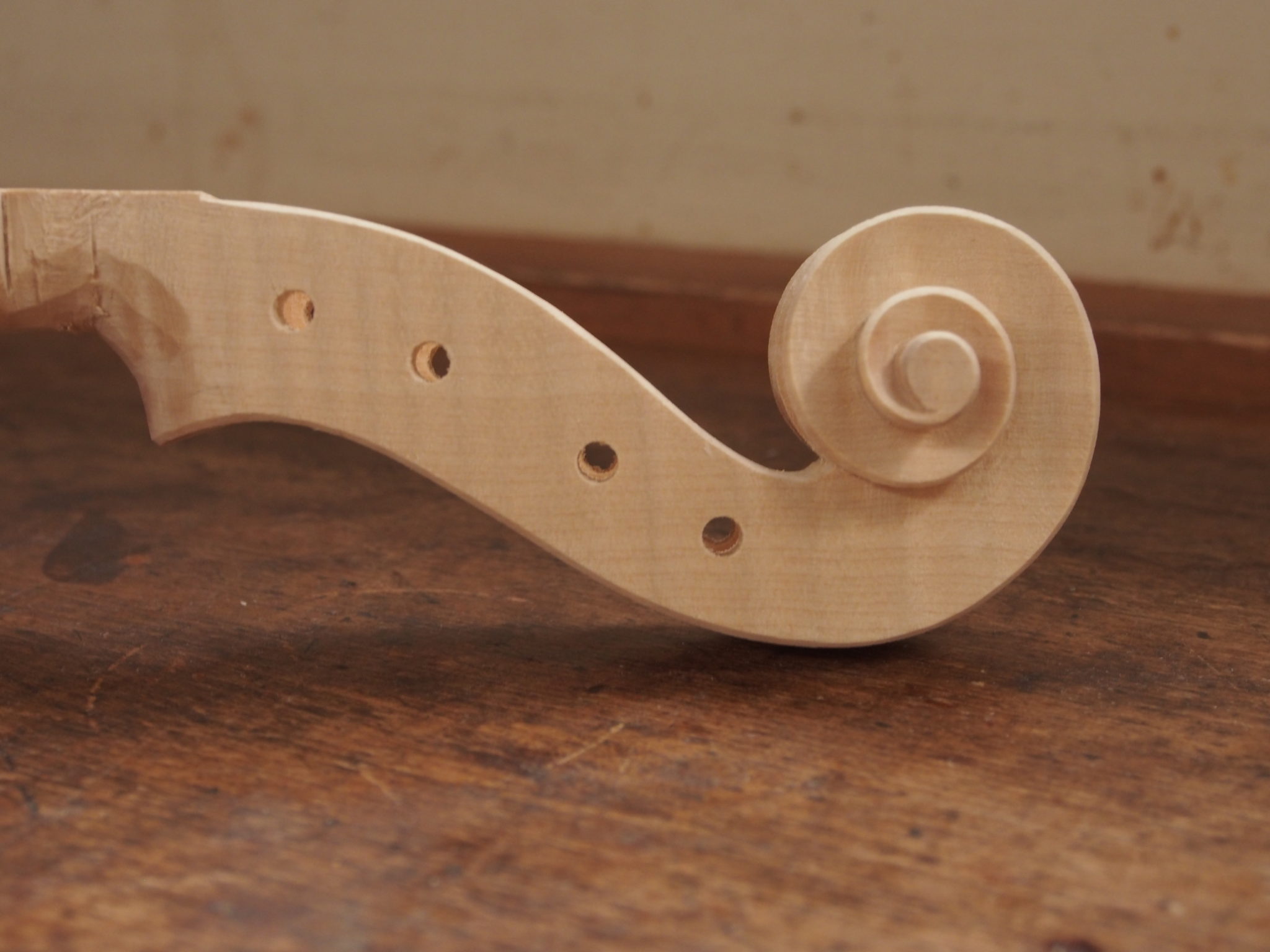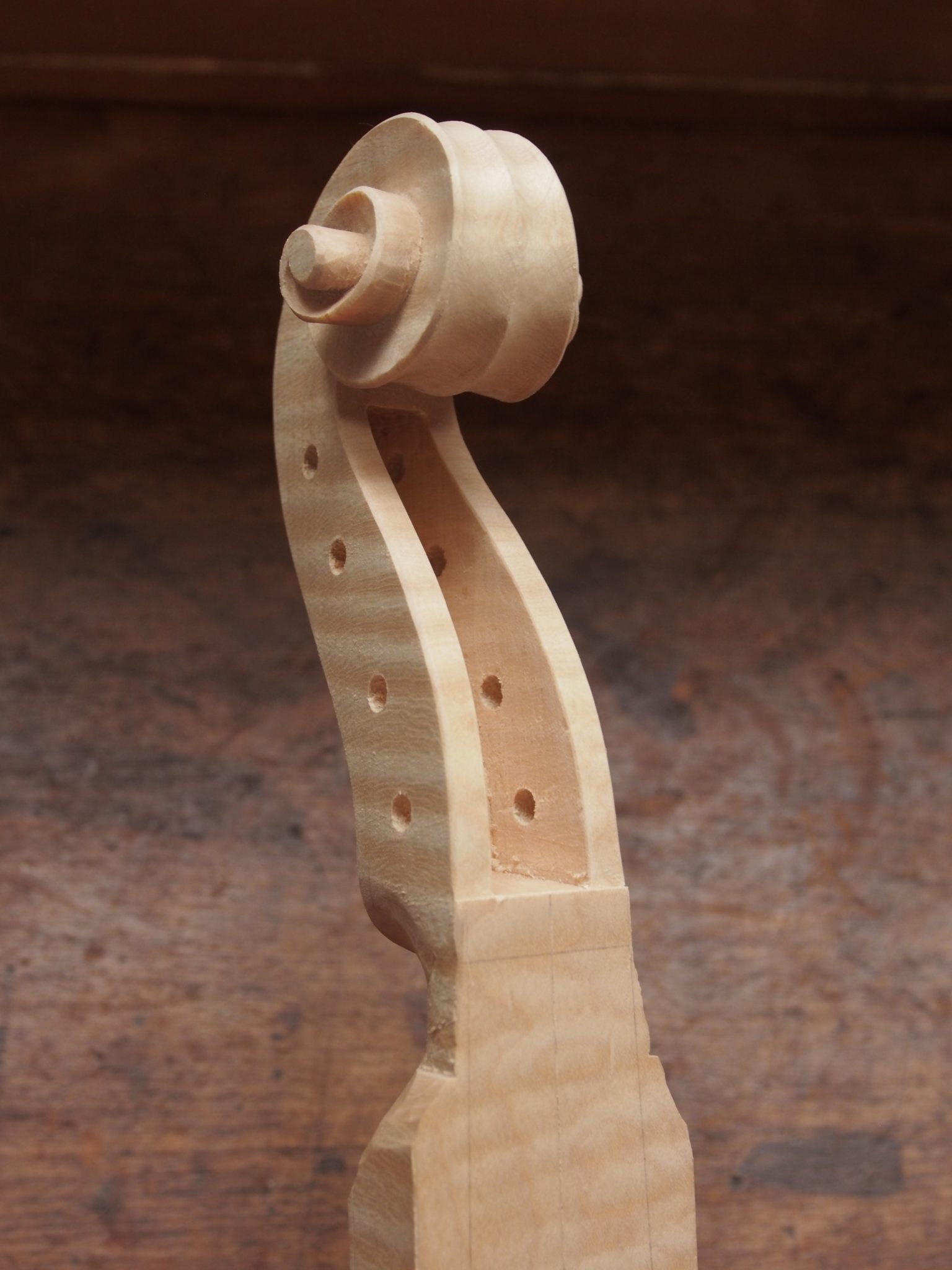 I’ve started by making the rib assembly; bending thin strips of maple to shape and gluing to the blocks fitted into the mould. Then I’ve made the scroll. The Maggini violin I use as a model has a head that I don’t think is orginal, so instead I’ve used the head of another Maggini viola. The heads on the early Brescian violas are often large, so I’ve scaled this down to slightly more than violin size to make it light and easy for the player.