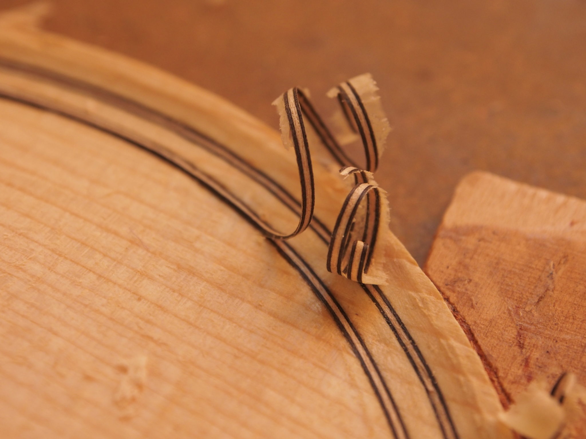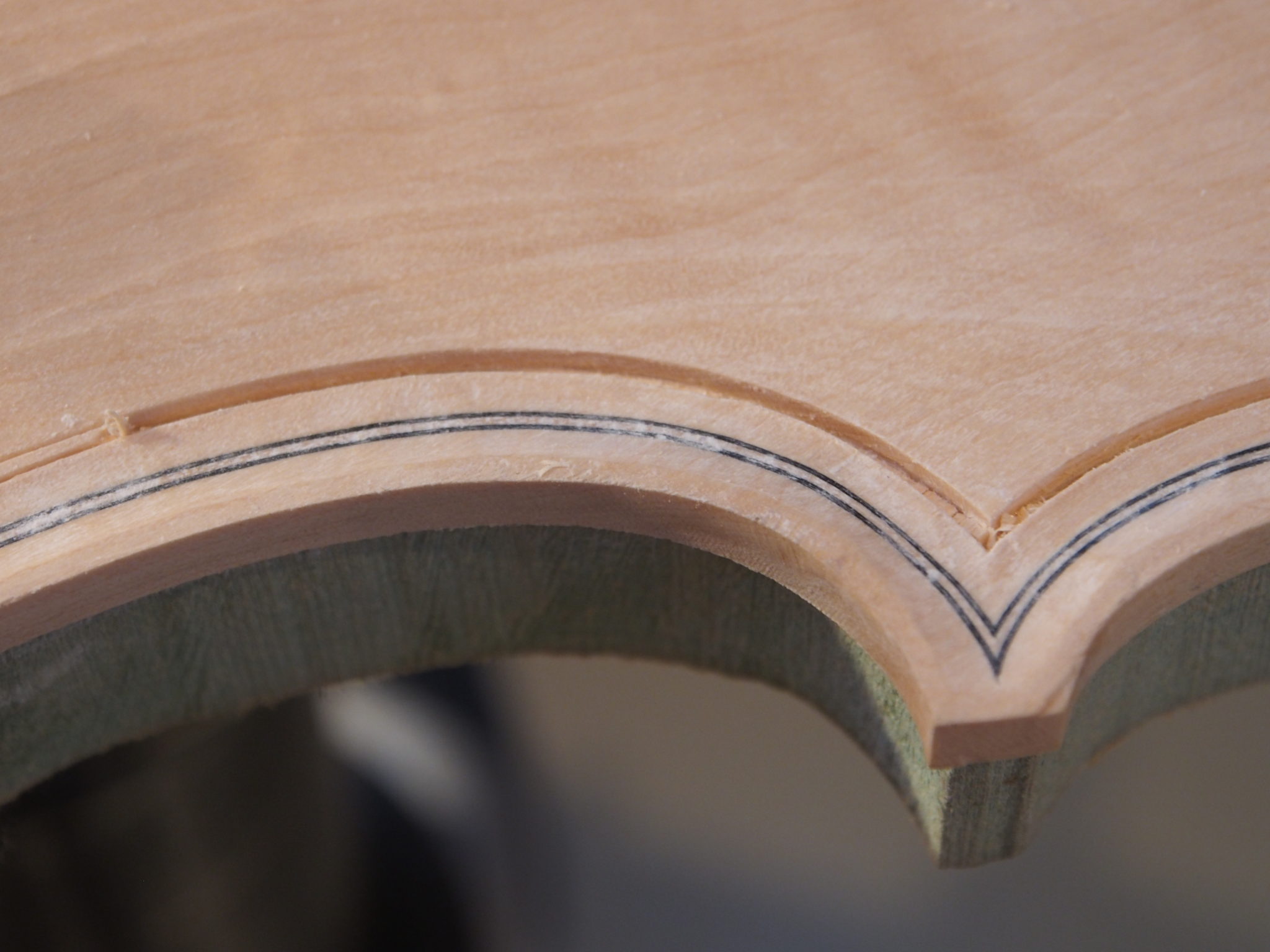 This week I’ve started work on the back and front. The back is made from a nice piece of figured maple which I bought in France a few years ago, which Rosemary picked out from my stocks. To go with it, I’ve chosen some fairly broad-grained spruce from the same woodyard. Firstly I’ve finalised the outlines from the rib assembly and then roughed out the arching shapes. After that I fitted the two rows of purfing; the double purfling is characteristic of Maggini instruments. The purfling itself is made of a sandwich of black-dyed pear and willow, inlaid into a channel cut into the plates.