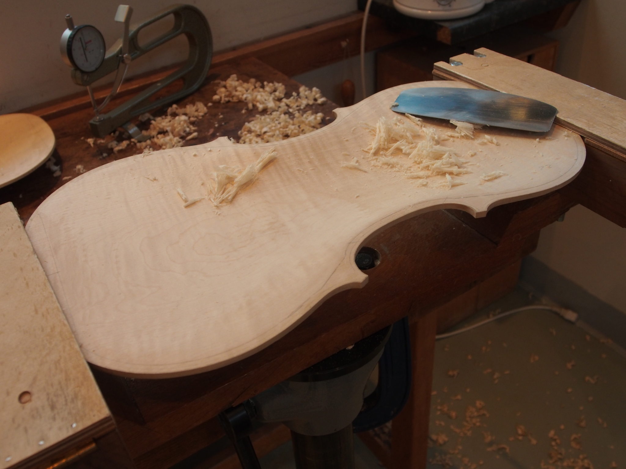 After arching comes thicknessing; finalising the internal shapes of the back and front. This is different for each instrument I make; although there are average measurements for the thickness and weight, I adapt these each time dependent on the density and stiffness of the wood, the model and the arching shape. I spend a long time tapping and flexing the wood as well as weighing and measuring until I’m happy with the end result.