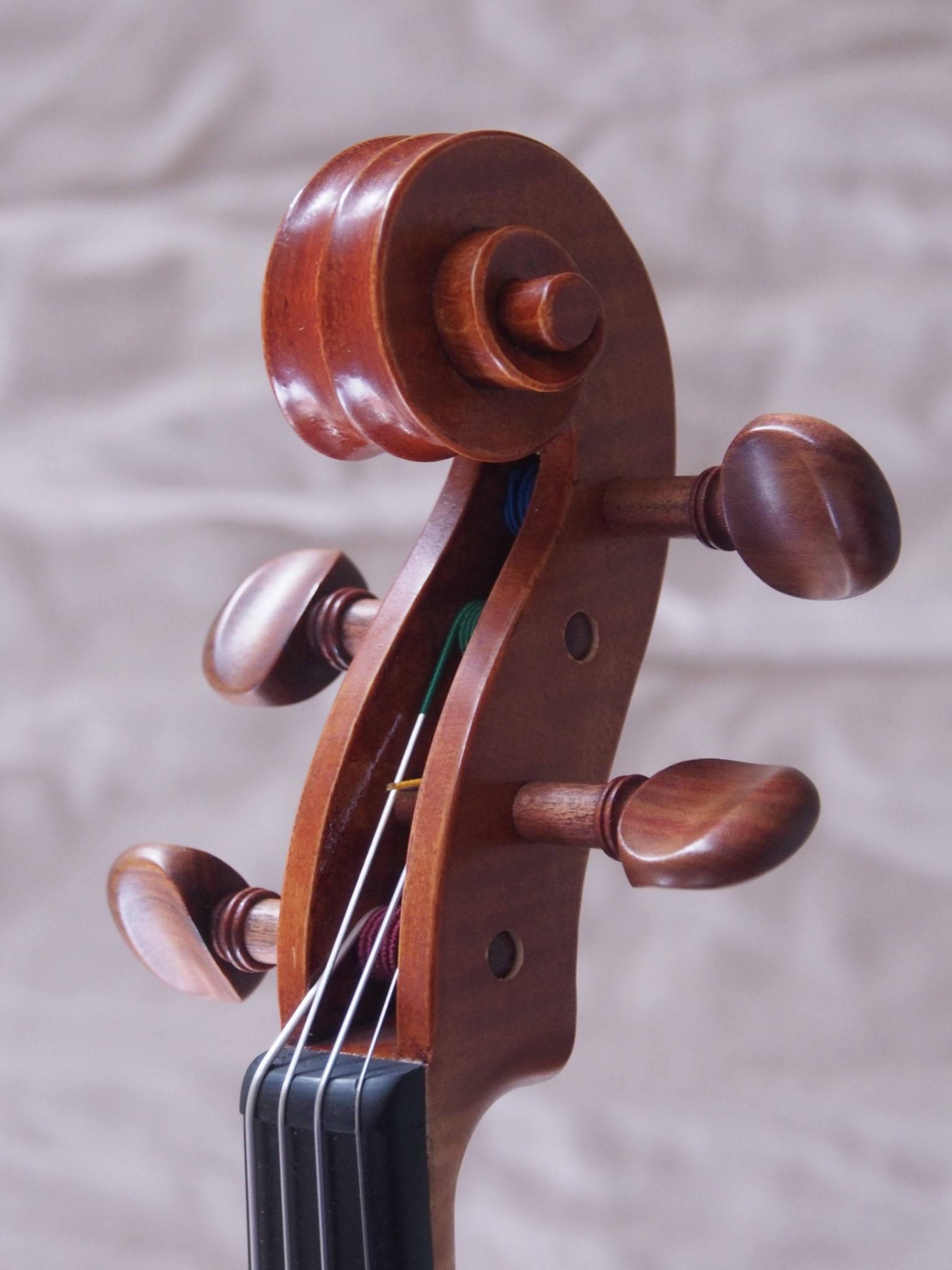 I’ve now finished the varnishing and set up the viola. For the varnish, I first stained the wood a warm golden colour to take away the cold ivory of the bare wood. After several protective sealing coats, I finished with two coats of oil varnish, with added red and brown pigments. I set up the viola carefully, using for the first time pegs made from plum wood – a sustainable alternative to the tropical woods usually used, and one I’v been keen to try.