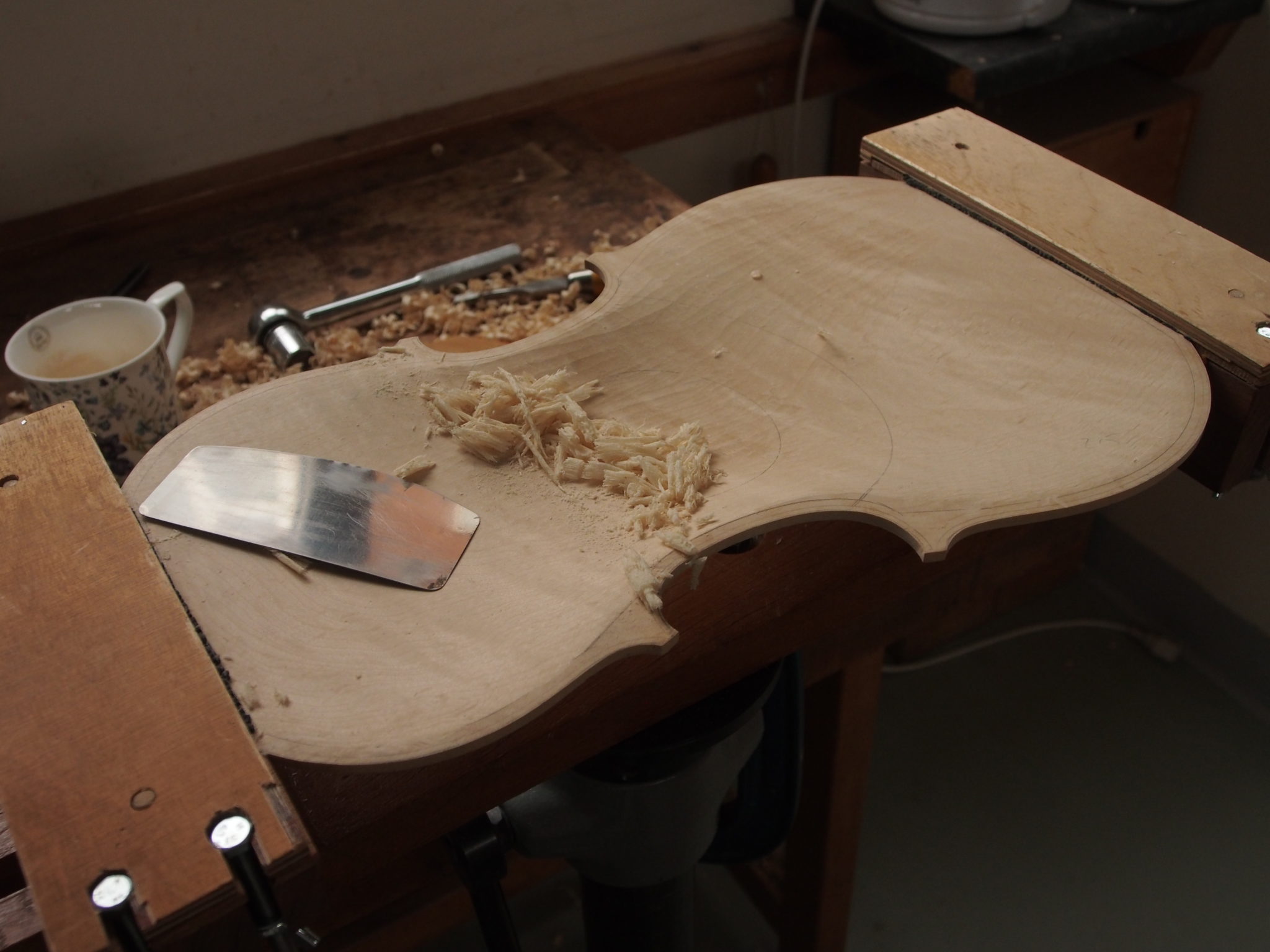 After arching comes thicknessing; reducing the inside shape of the viola. This is one of the areas where the craft of violin making becomes a sort of black art. We have to make a balance between weight, stiffness and the sound the plates make when they are tapped, taking in to account the density of the wood and the shape of the arching. With experience you get a feel for when to take off more wood and when to stop.