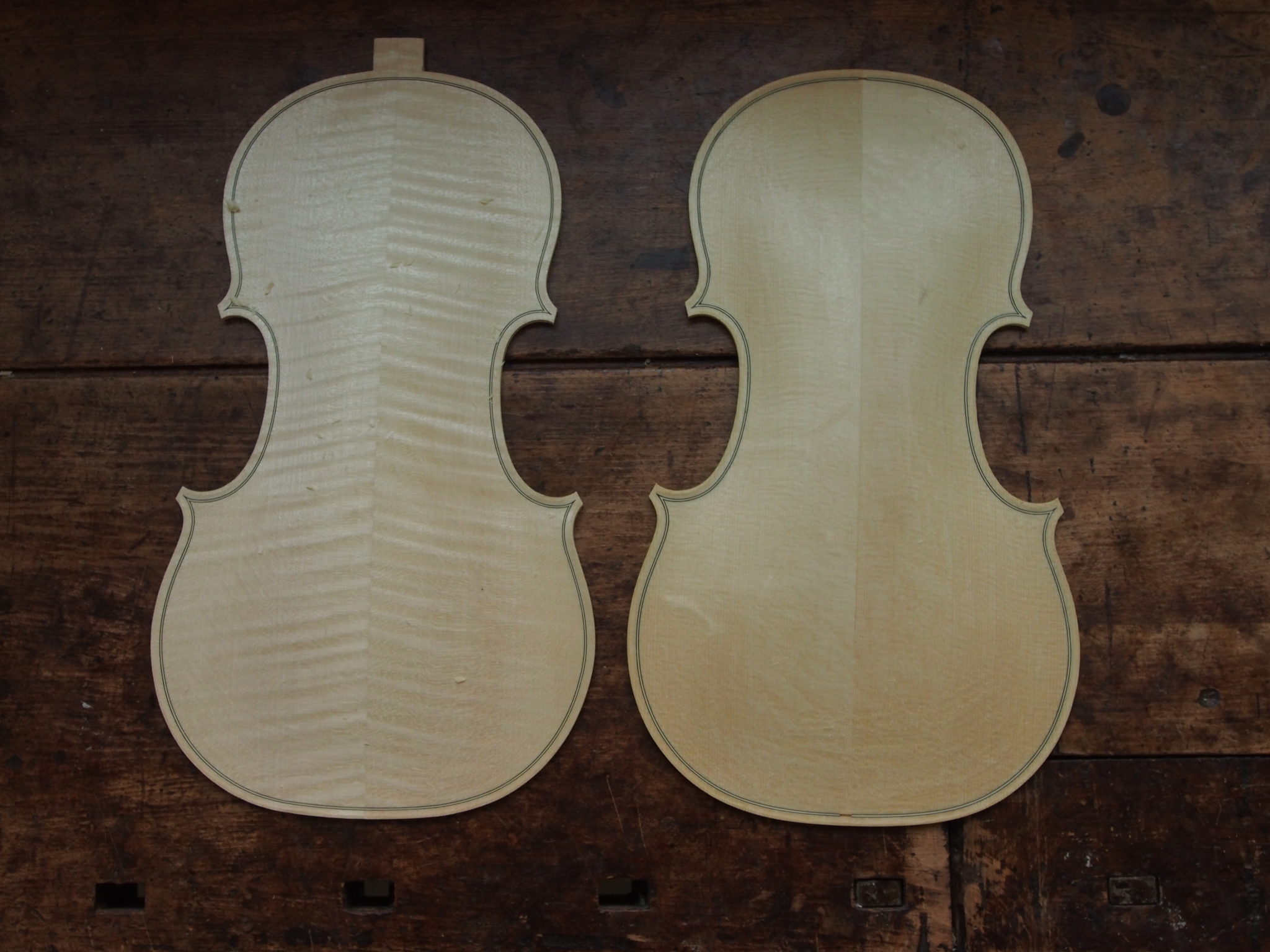 With the purfling fitted round the edge, I have now almost finished the arching, ready to finalise my drawings for the decoration and start work on that.