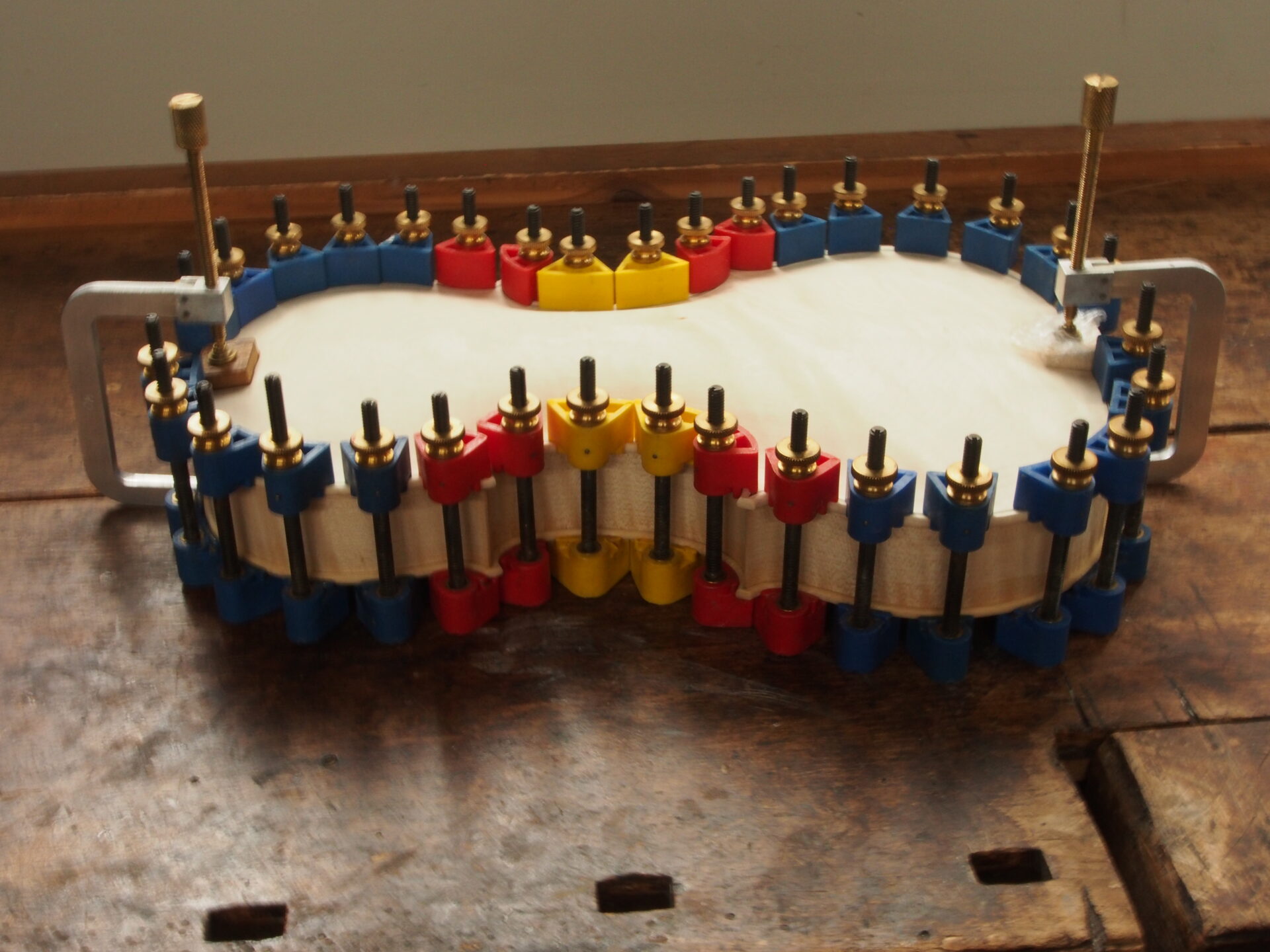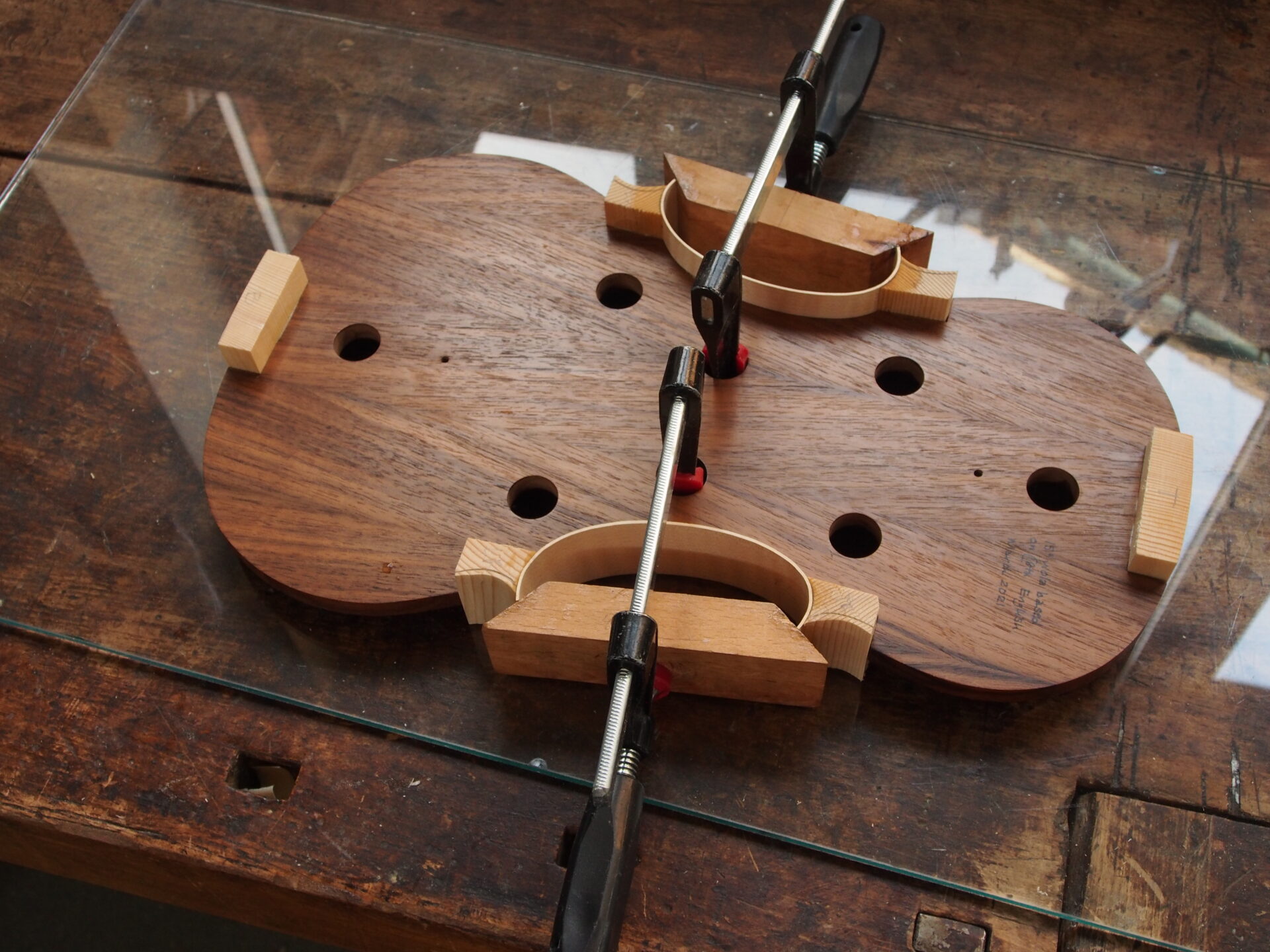 It’s a lovely outline with graceful, long Amati-style C bouts. The 18th century English makers were in thrall to the Amati and Stainer style of making and their work owes a lot to this inspiration. I decided to make my new mould from walnut, as opposed to my customary plywood. One because I had run out of plywood and didn’t want to buy a whole new sheet and two because this was what was usually used in the 18th century, as it’s a stable wood. I glued together five strips of wood to make the mould, which means it’s even more resistant to warping than had it been one piece. And wow, it’s lovely to work and looks beautiful. I’ll be sticking with that for future moulds.