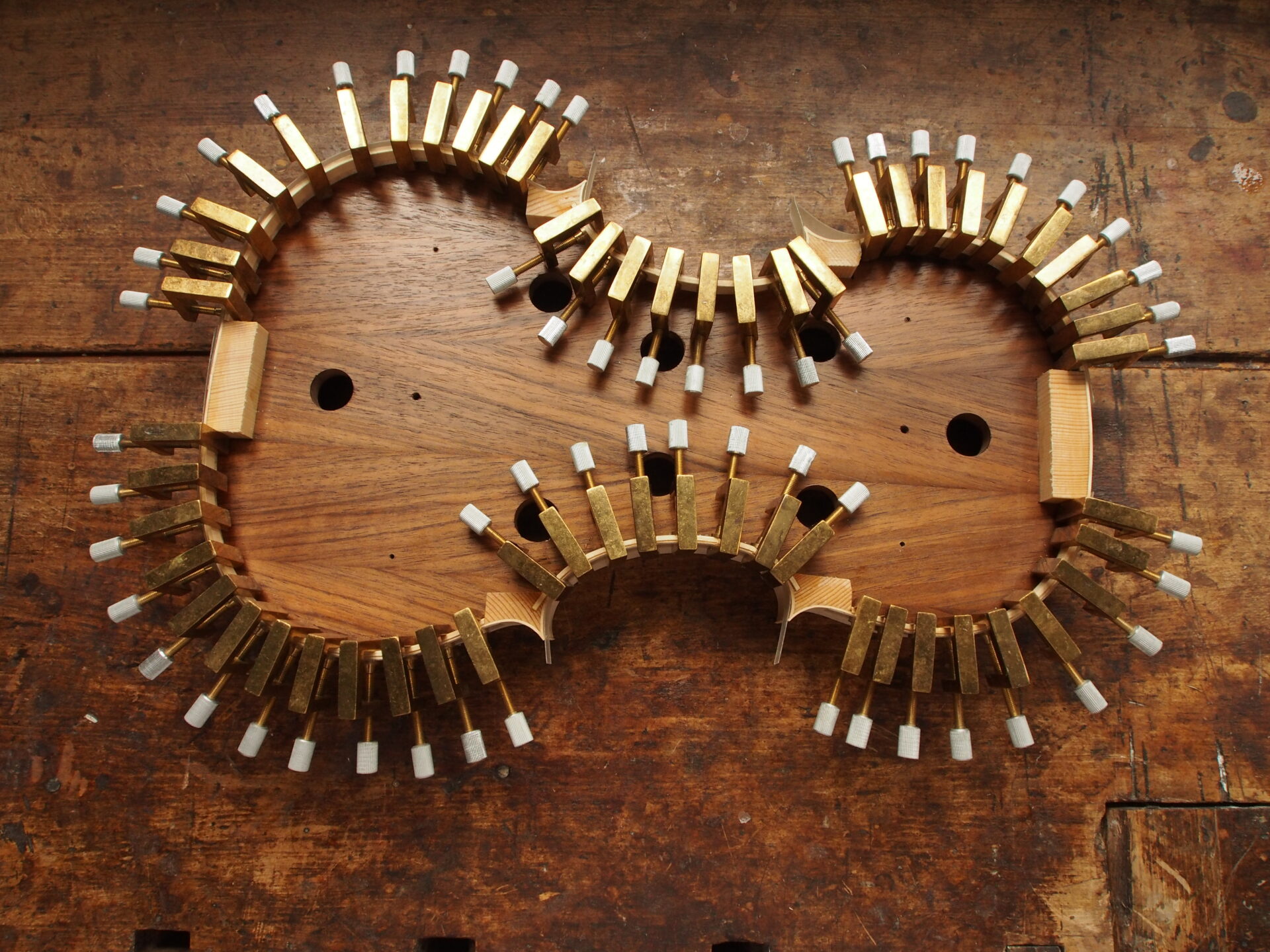 The photographs show some of the sequence of making the ribs: the C ribs, made from strips of maple planed to 1mm thick, bent and glued in place; the linings glued in place; and finally the finished rib structure.