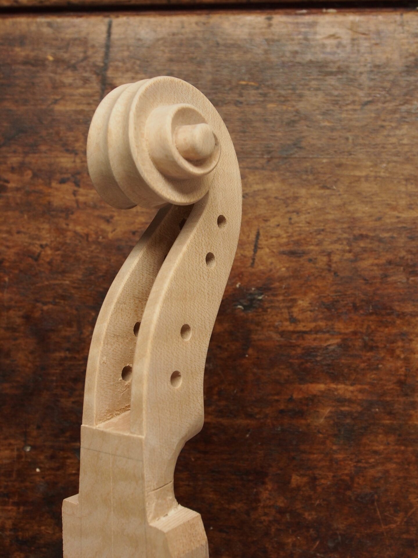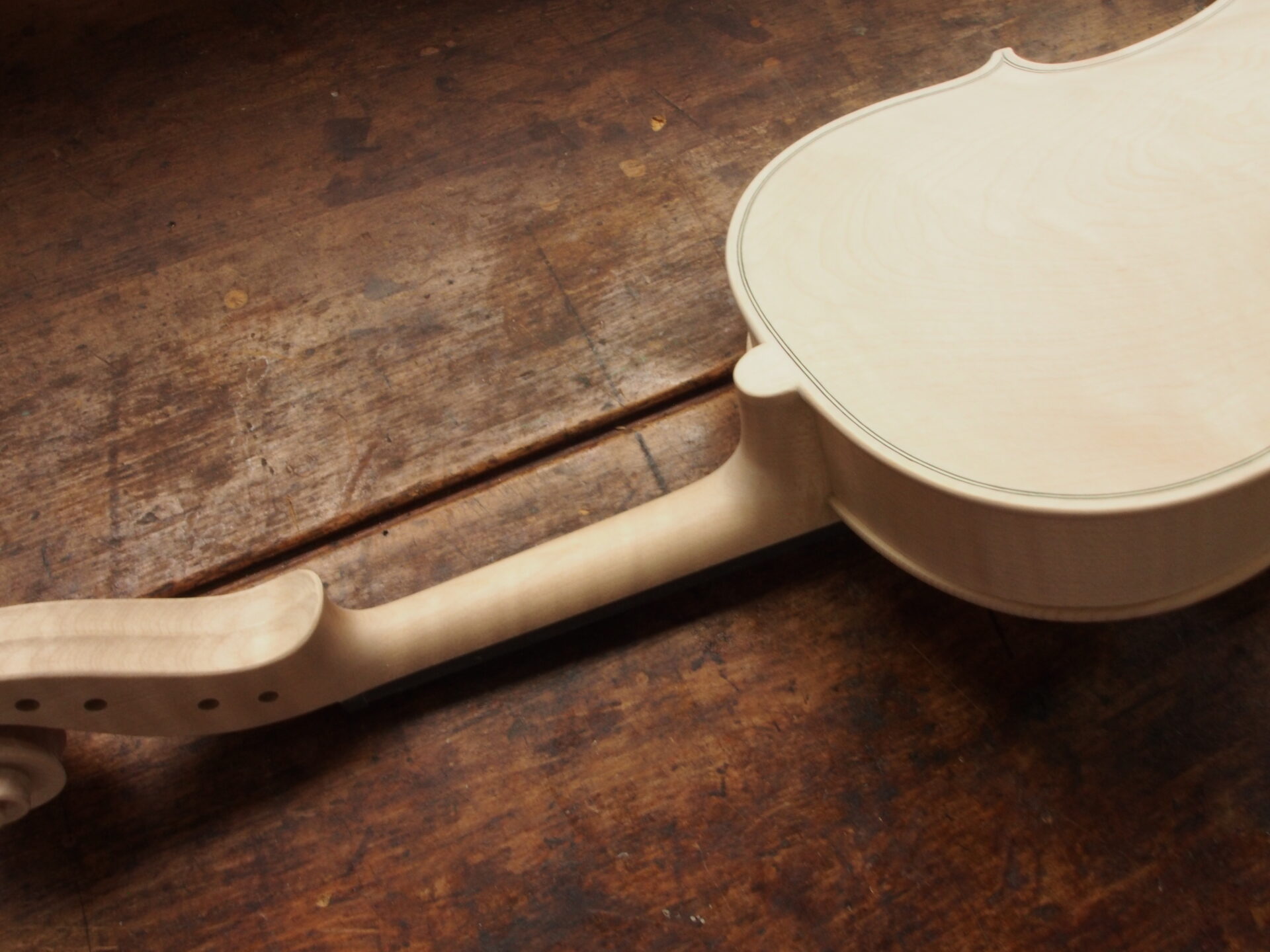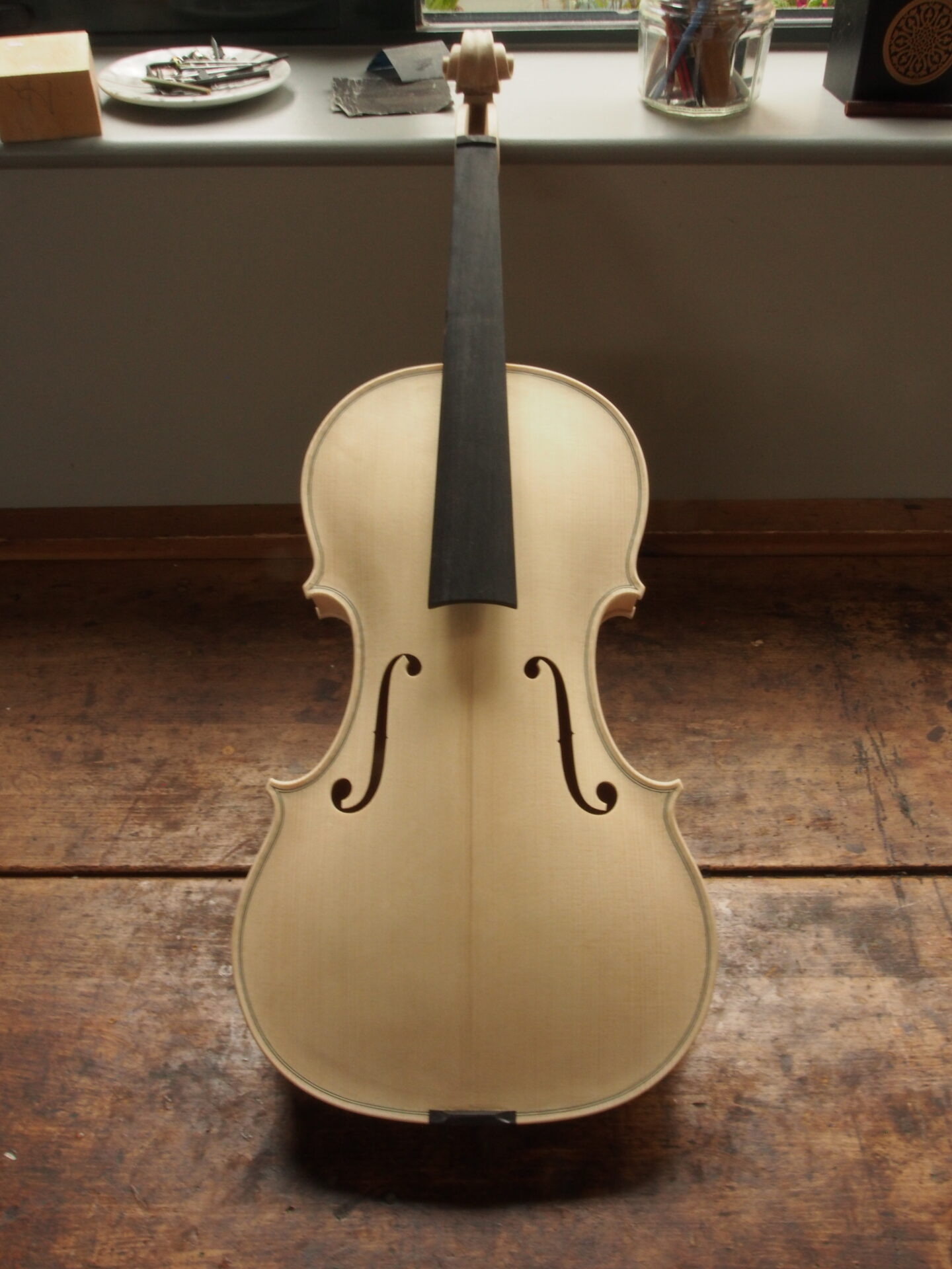 I’ve now fitted and shaped the neck. Jo was keen for a slender neck, narrow at the nut, and I have been happy to oblige. The viola is now finished ‘in the white’, ready for varnishing.