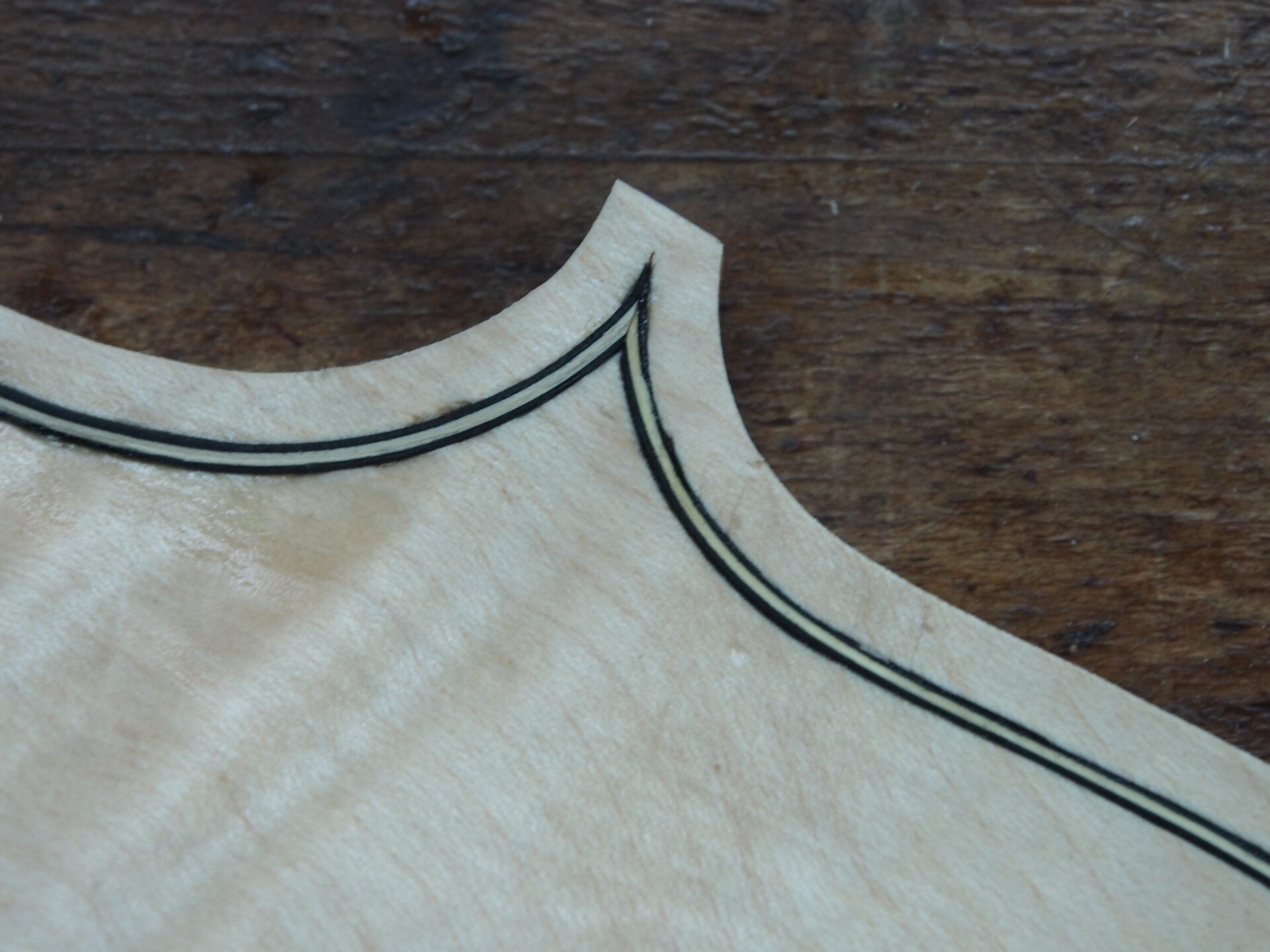 I start by cutting a channel all round the back and front, then bend the purfling and trim to make neat joints in the corners. Finally it’s glued into place.