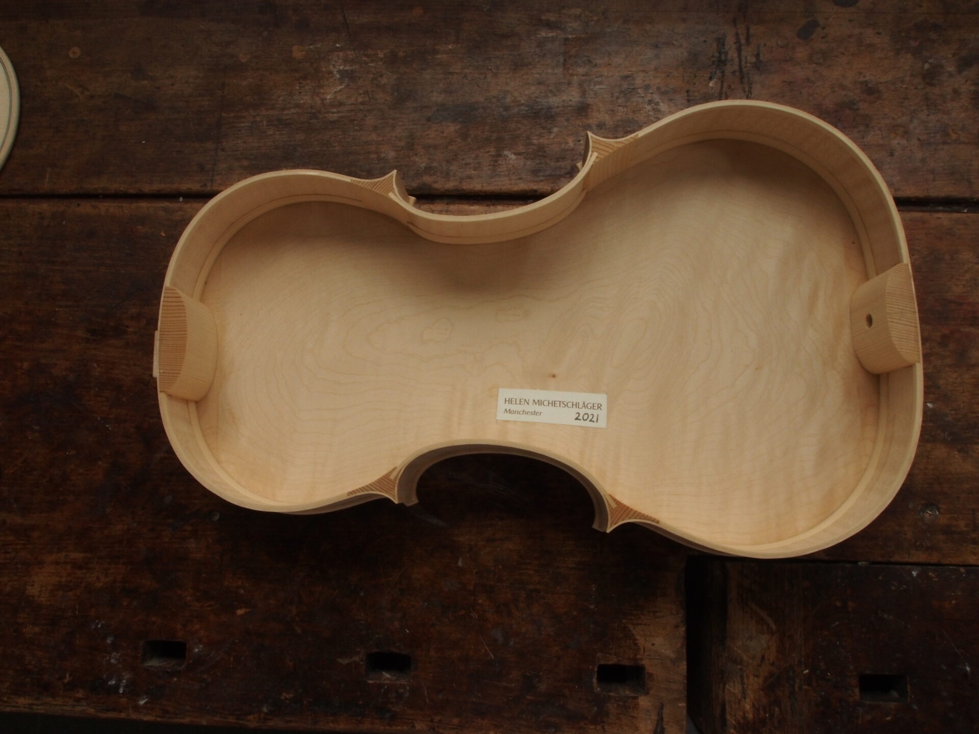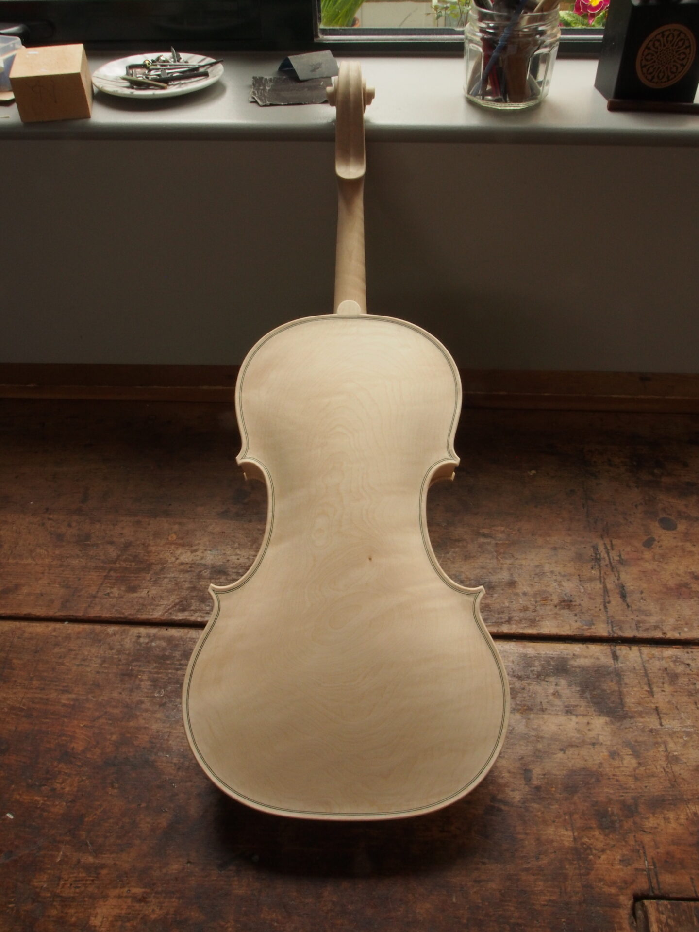 The viola is now finished; it has a chestnut brown oil varnish which shows off the beautiful wood. I’m pleased with the sound which is rich and chocolatey in quality, powerful and resonant, with a fast response.
