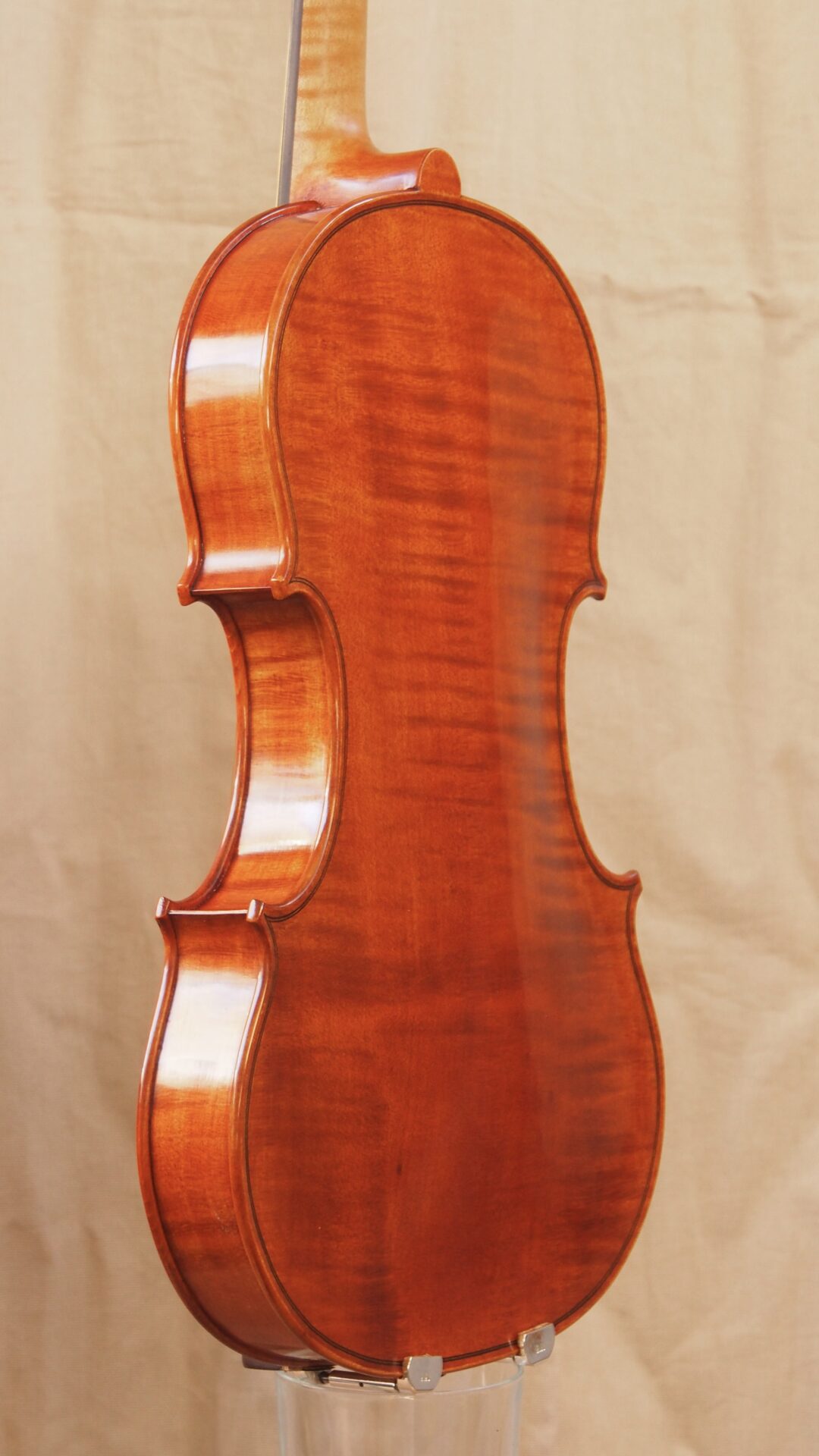 The violin is now finished; I spent a lot of time on the wood colouring under the varnish, as this is a key aspect of making the final instrument look good. I’ve gone for a slightly reddy/golden varnish, and the maple of the back looks lovely underneath it. At a first try, the violin is sounding good; a rich, warm and projecting sound. It will be a while till my customer collects it so I have the luxury of lots of time to get different players to try it and to make any necessary soundpost and string adjustments