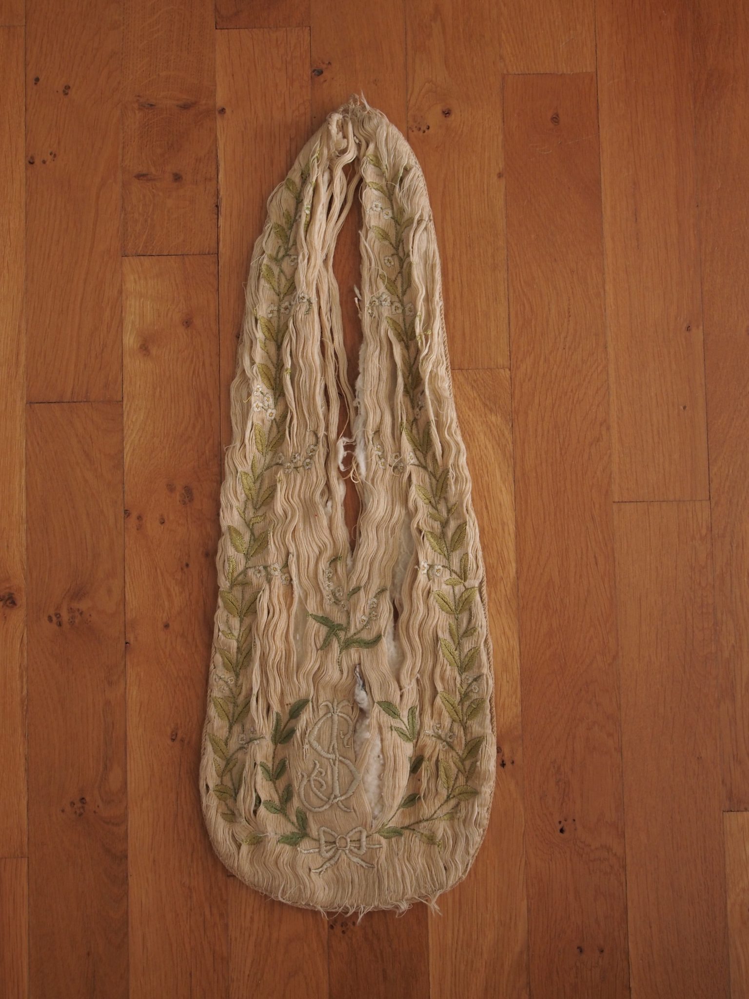 One of my colleagues gave me this wreck of a violin blanket recently. It was in a nineteenth century violin case. It’s hand embroidered, probably on a silk/cotton fabric. The warp threads are intact but the weft threads, probably the silk, have almost totally disintegrated, held together only by the embroidery.